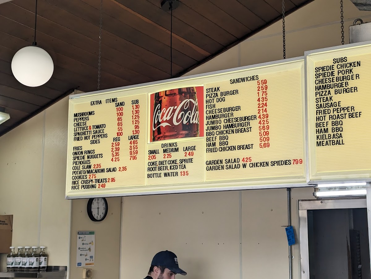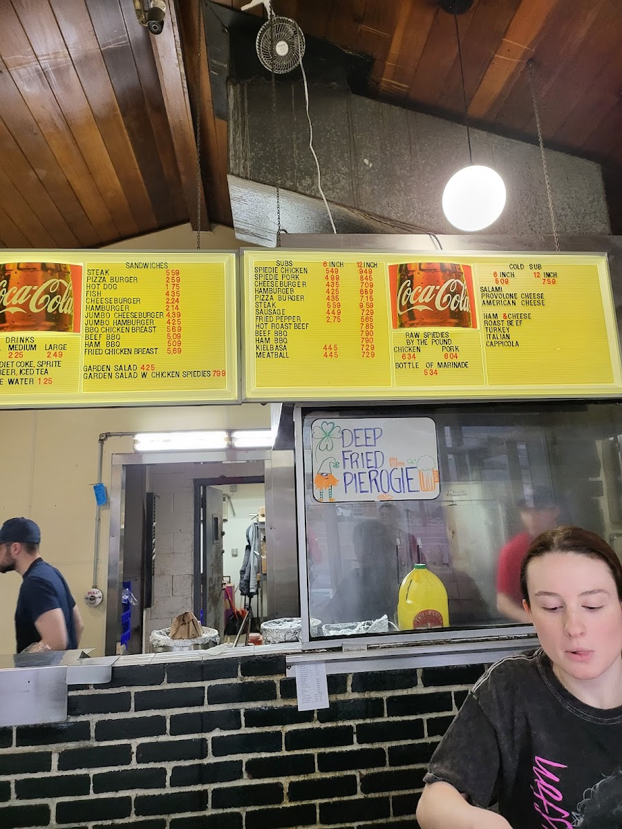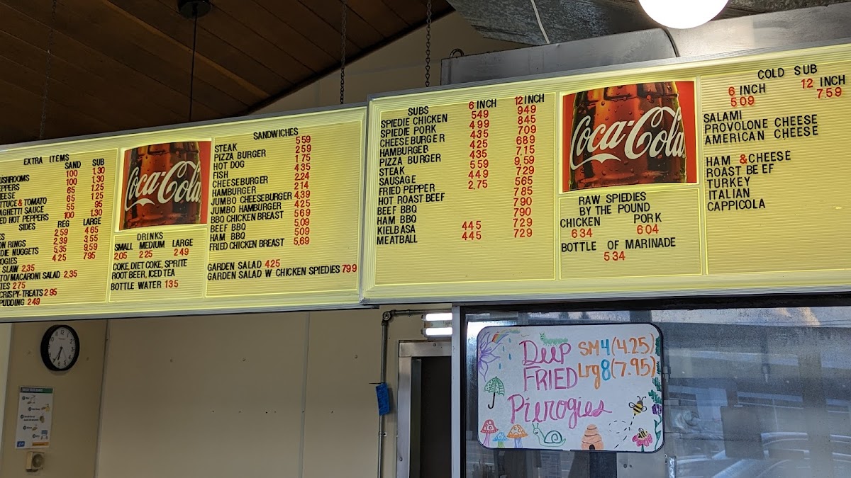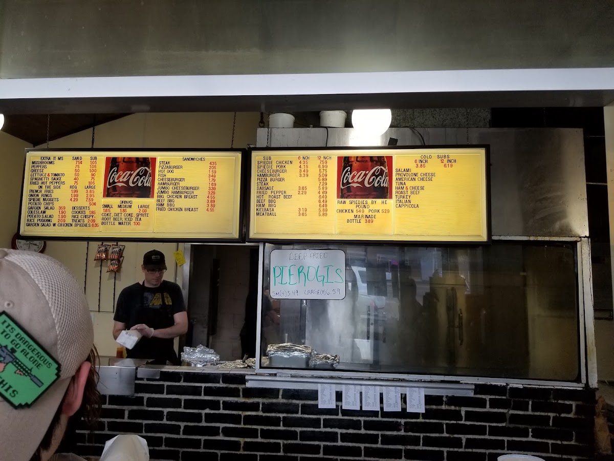 Popular choices include the pork and chicken spiedie subs, which showcase marinated meats grilled to tender perfection and served on soft bread. For those seeking a little variety, options like the jumbo cheeseburger or a large spiedie sub with fried hot peppers provide a satisfying and flavorful bite. Sides such as fries, pierogis, and garden salads complement the main dishes nicely, rounding out the meal in a straightforward, approachable way.
